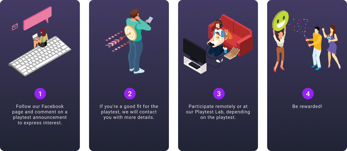 Follow our Facebook page to hear about upcoming playtests. When you see a playtest you’re interested in, comment “Interested” (or follow the instructions in the post). We’ll message you on Facebook to see if it’s a good match for you.